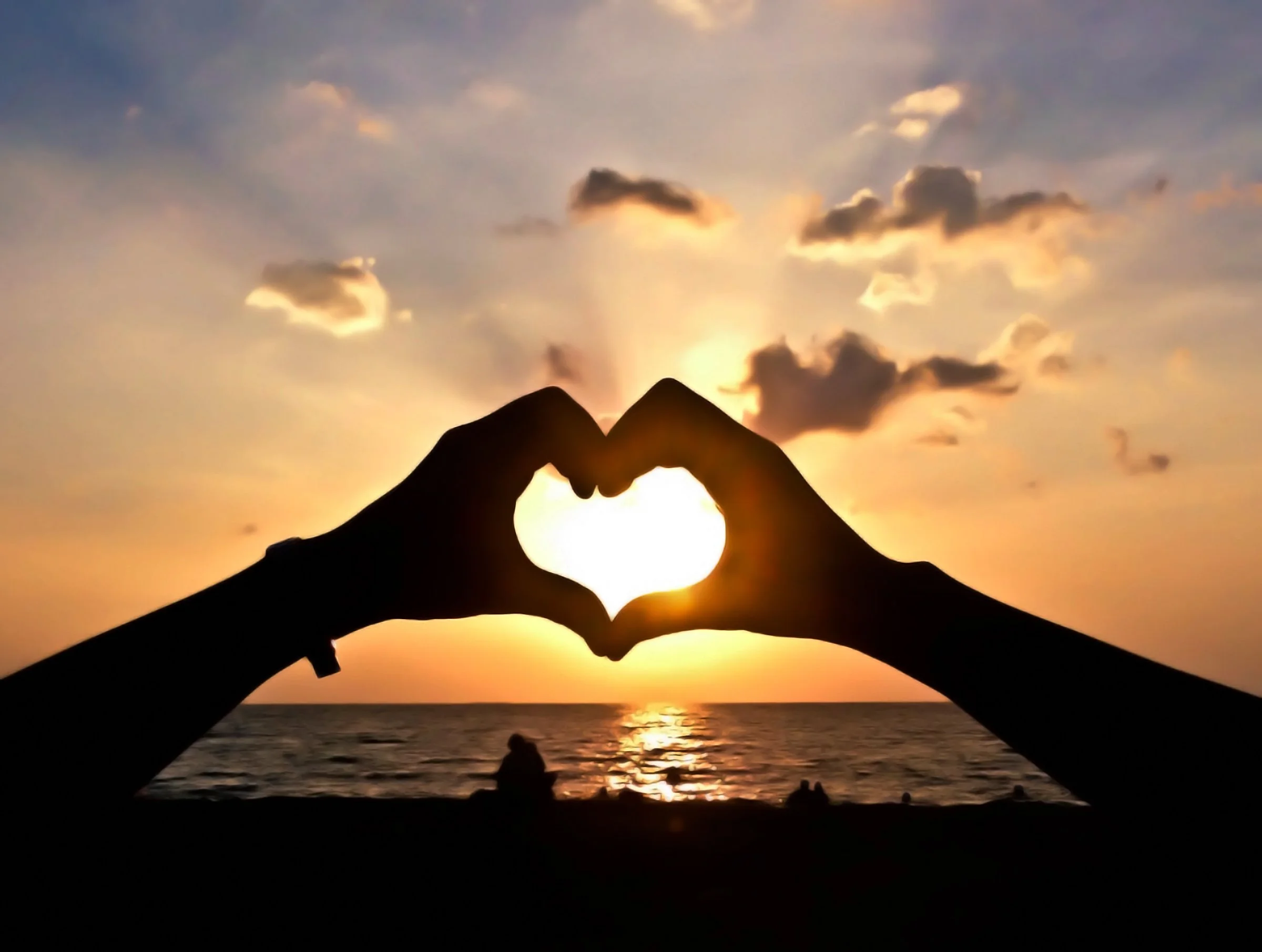 Hands forming a heart shape around the setting sun on a beach at sunset, with a few clouds in the sky.